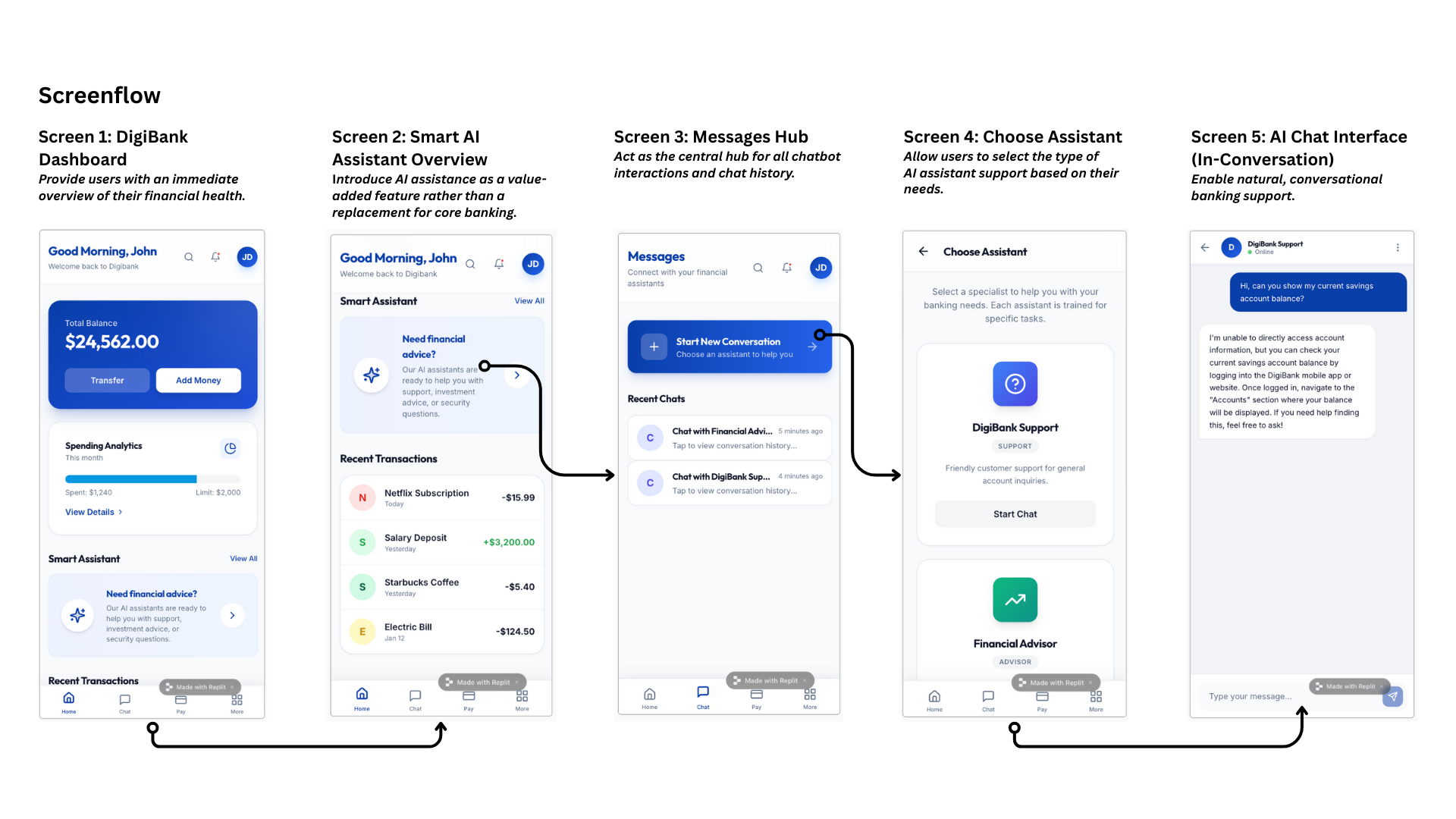 This video demonstrates how I designed and implemented an AI agent–driven chatbot architecture integrated into DigiBank’s end-to-end customer journey. The solution is built around a layered system model, where a conversational AI agent orchestrates interactions between the user interface (UI) and banking APIs, enabling secure, contextual, and task-aware assistance.